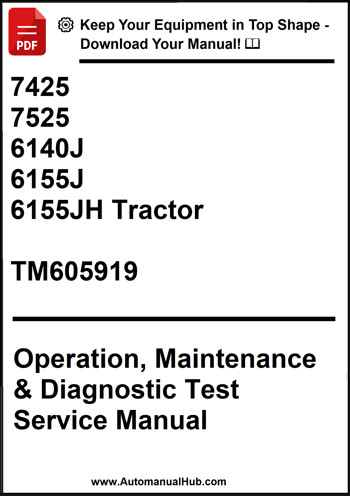 This John Deere 7425, 7525, 6140J, 6155J, 6155JH Tractor Operation, Maintenance & Diagnostic Test Service Manual TM605919 - PDF provides comprehensive and detailed guidance on tractor operation, maintenance, and diagnostics. This professional-grade manual ensures a thorough understanding of the features and functionality for your tractor.